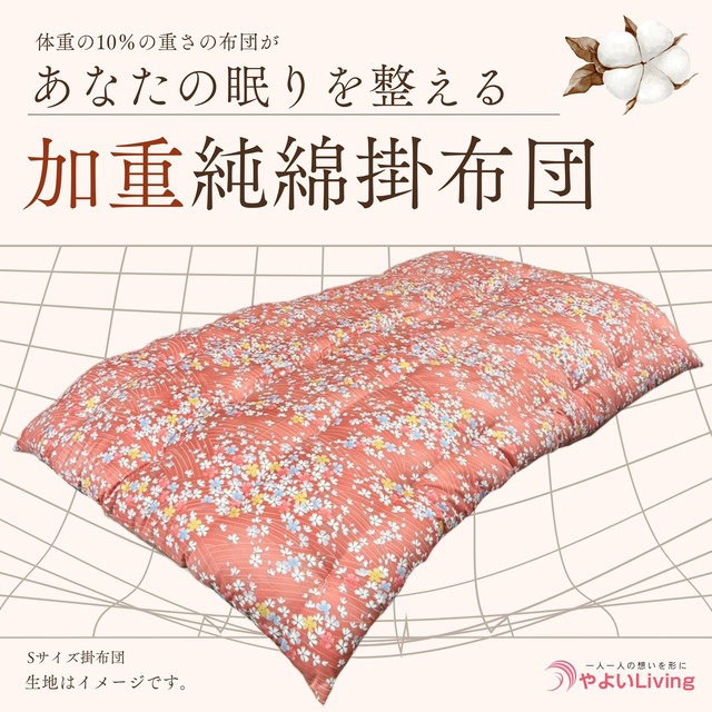 【成人の方向け】※詳細は注意事項をご覧ください。 適度な重さが体を包み込むことで睡眠の質を向上させると注目されており、最新の研究によると、重い布団を使用することで安心感が得やすく、ストレスホルモンの分泌が抑えられ、深い睡眠を誘発しやすくなります。 さらに本製品はコットン(綿)の良さを最大限に感じることのできる一枚です。 優れた吸湿性と通気性が特徴のコットンは、寝ている間も快適な湿度を保ってくれるため、一年を通して快適にお使いいただけます。 こちらのおふとんは、受注生産にてお届けいたします。 お客様一人ひとりのご注文に応じて、熟練の職人がひと針ひと針心を込めて仕立てするため、ご注文からお届けまで約2週間ほどお時間をいただきます。 手作業で丁寧に作られた特別なふとんをお楽しみください。 さらに、長年ご使用いただき、コットンがへたってしまった場合は打ち直しが可能です。 打ち直しによりふとんはふっくらとした状態を取り戻し、再び長くご愛用いただけます。 サイズ:150㎝×200㎝ 中綿量:4㎏(生地込で総重量5㎏) 生地:綿100% 和布団専用生地 柄はお任せとなります。ご希望がございましたらお問い合わせください。 中綿:綿100%(プレオーガニックコットン) ※お手入れ方法とご使用上の注意※ ・本製品は適度な重さがございます。お体に圧力を感じますので寝返りがうてない高齢のお客様や小さいお子様には向かないものとなります。 ・お天気の良い日には、日中に太陽の光を当てて湿気を飛ばしましょう。天然のコットンはお日様の力で再びふっくらと膨らみます。 ・繊維をふかふかに保つため、しまう時はたたかずに箒などで軽く払いましょう。 ・汚れがついてしまった場合は、固く絞った布で軽く叩いて汚れを落としてください。 ・ご家庭でのお洗濯は、綿の偏りの原因になりますので、洗濯が必要な場合は専門店にお任せください。