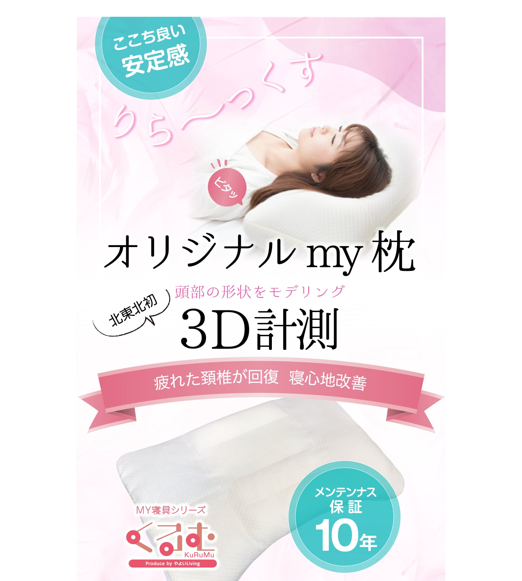 専門スタッフが、寝姿勢のまま3D計測したモデリングデータを元に、お体にピッタリ合った枕をお作りいたします。頭と頚椎の形状にこだわり、快適な眠りのための最適なサポートを提供します。